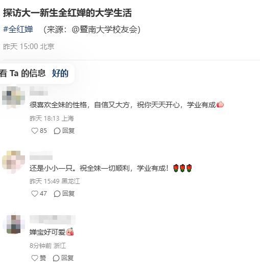 大一新生全红婵在暨南大学“很开心”