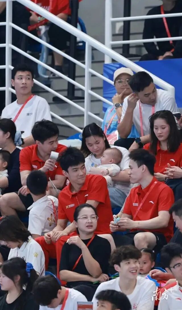 结束自己的全部比赛之后,全红婵仍会时常出现在观众席,为广东队和中国跳水加油,还时常帮队友“抱娃”,与观众互动。